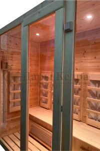 Это специально оборудованная кедровая кабина для прогрева тела человека сухим теплом. Воздух в таких парных не нагревается. Инфракрасные лучи воздействуют на тело, равномерно прогревая мышцы, суставы и органы. Керамические излучатели похожи на лампы, имеют высокую температуру нагрева, поэтому защищены противоожоговыми решетками. Тело человека в таких саунах нагревается интенсивнее. Работает кабина за счет электричества. Инфракрасная сауна с керамическими излучателями подойдет как для домашнего использования, так и для коммерции.