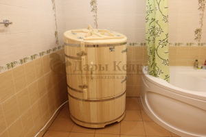 Богатырскую бочку выбрали с мужем по совету менеджером, т.к. супруг тучный и высокий. Ему там вполне комфортно! Спасибо Дарам Кедра за такую красоту!