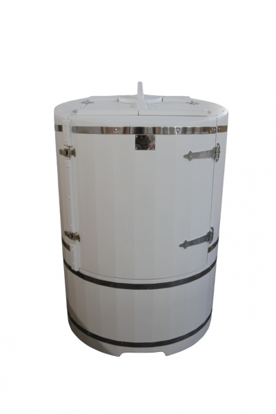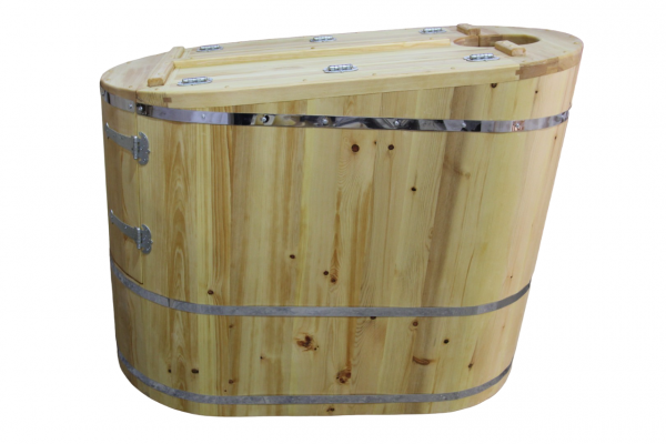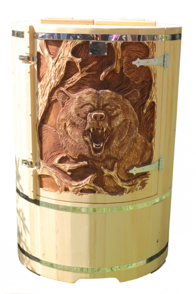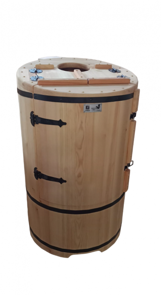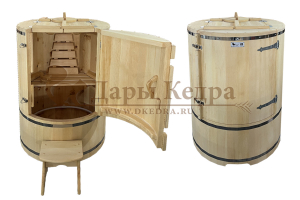 Это круглая фитобочка из кедра увеличенных размеров с толщиной стенок 45 мм. Подходит для людей высокого роста и крупной комплекции. Фитобочка оборудована откидными створками, дверцей и отверстием для головы. Во время парения человек сидит внутри кедровой бочки, а голова находится снаружи. Благодаря этому исключается возможность перегрева. Подлокотники из кедра, встроенные ручки на створках и двери делают эксплуатацию более удобной.