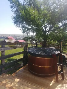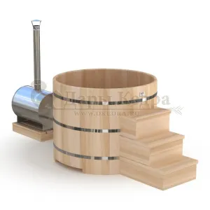 Это уличная баня, которой можно пользоваться круглый год. Купель представляет собой круглую емкость для воды, внутри которой располагаются сиденья из кедра. Подогрев воды осуществляется приставной печью с дымоходом. Для удобства пользования японская баня фурако оборудована внешней и внутренней лестницей из кедра.