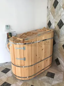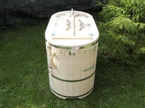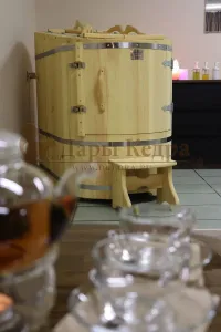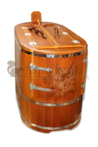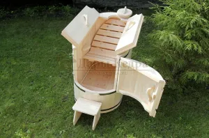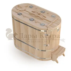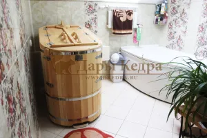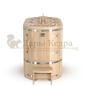 Готовый комплект - это полностью укомплектованный набор с полулежачей фитобочкой для процедур парения. Такая модель наиболее комфортна, так как позволяет принимать процедуры полулежа. Толщина стенок составляет 40-45 мм, что позволяет увеличить срок службы изделия. Фитобочка оборудована откидными створками, дверцей и отверстием для головы. Во время парения человек находится внутри кедровой бочки, а голова снаружи. Благодаря этому исключается возможность перегрева