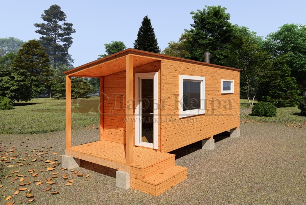Это классическая прямоугольная модель бани с двумя отделениями: предбанником и парилкой, а так же удобной терассой. Предбанник оснащен лавочкой и вешалкой. Парилка оборудована двухуровневым открытым полком и печью. Время растопки такой бани не превышает 30 минут. Каркасно-щитовую баню можно заказать как в готовом, так и в разборном варианте. В разборной модели готовые щиты из кедра быстро собираются в полноценное строение, что также позволяет исключить лишний строительный мусор. Такая баня не требует полноценный фундамент, поэтому при необходимости ее можно перенести в другое место.