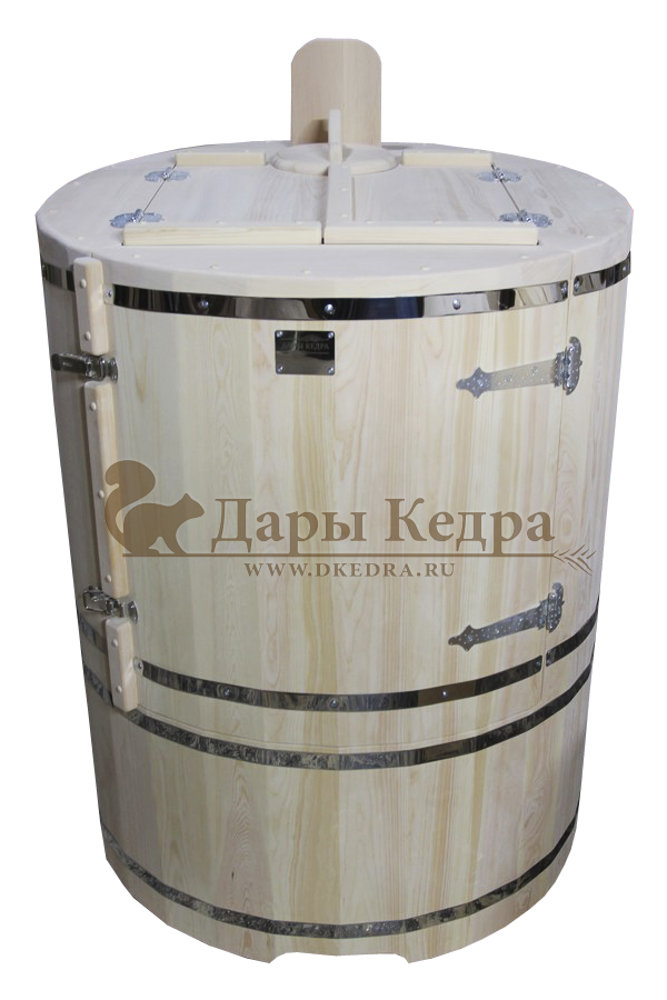 Кедровая бочка (фитобочка) двухместная «Профессиональная» Двухместная фитобочка из кедра - это парная, в которой удобно принимать процедуры двум людям. Она оборудована откидными створками, дверцей, отверстием для головы и перегородкой (по желанию). Толщина стенок составляет 40-45 мм, что позволяет увеличить срок службы изделия. Во время парения человек находится внутри кедровой бочки, а голова снаружи. Благодаря этому исключается возможность перегрева. Подлокотники из кедра и внутренние ручки делают эксплуатацию фитобочки более удобной. Парение в фитобочке благотворно влияет на организм в целом: повышается иммунитет, выводятся шлаки и токсины, улучшается работа органов тела и состояния кожи.